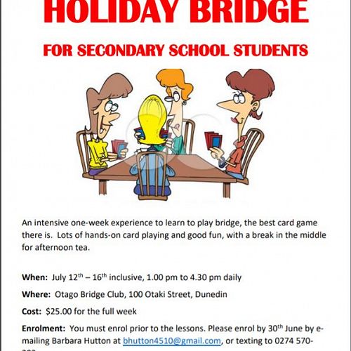 Visit this article"The best card game". Otago Bridge Club is providing secondary students with a chance to learn how to play Bridge.
