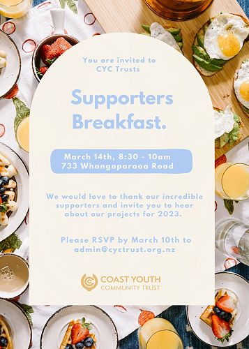 Supporters breakfast on Tuesday 14th March. This is a chance for anyone who may be interested in learning more about mentoring, or any of the work that CYC Trust does, to come along and hear more about our heart for the young people in our community. If this would be of interest to anyone you know, we would love to have them come and join us for brekky!