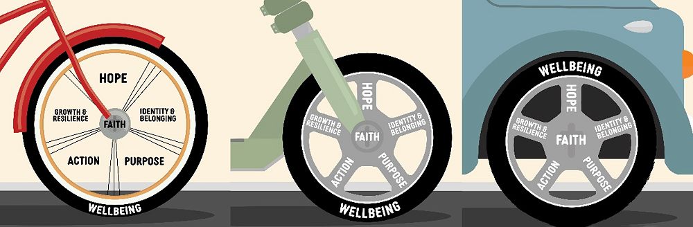 The framework (as pictured above) is visualised as a wellbeing wheel; Primary has a bike, Middle School a scooter and Senior School a car. The wheel spokes are labelled Hope, Identity and Belonging, Growth and Resilience, Purpose, and Action. These spokes are set around the hub of “Faith’. We believe that faith in Christ is pivotal to moving toward optimal wellbeing and it is faith that resources every spoke. As the year progresses, you will be able to increasingly see these posters around the school.