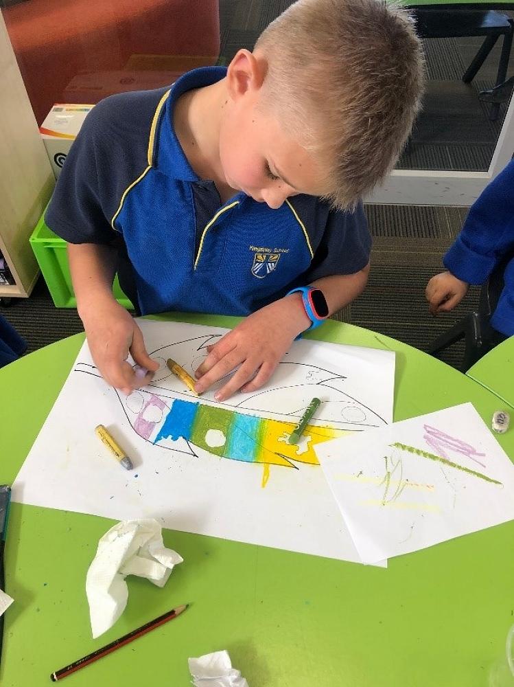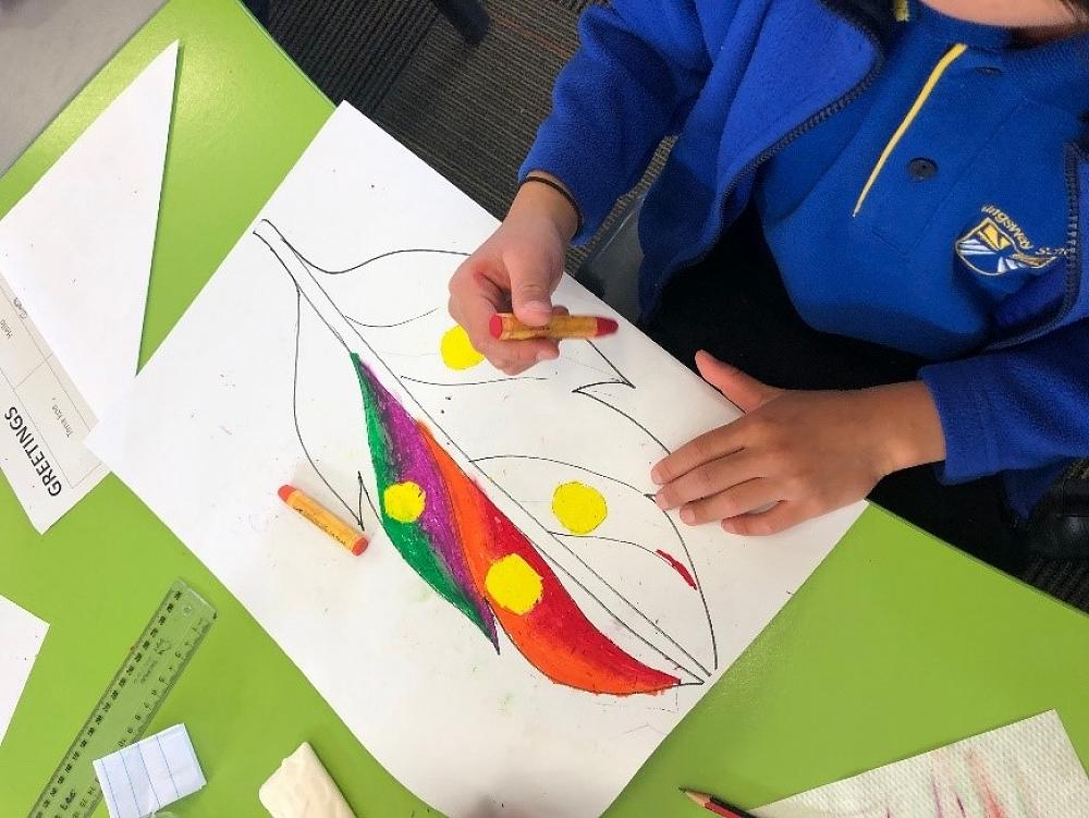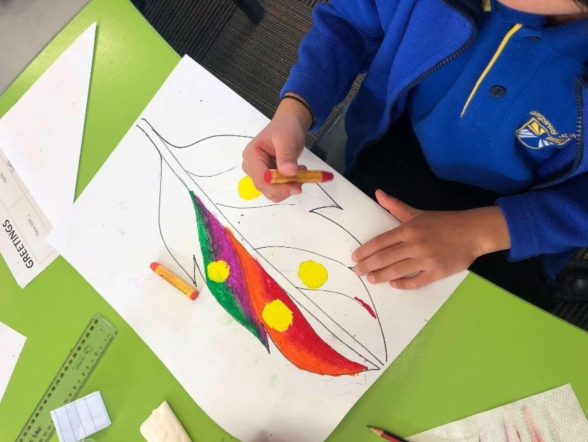 For our Visual Arts unit, we decided to create a collaborative piece of art. Firstly, each student thought of a unique design for their feather. Once they had chosen their design, they used bright pastels to carefully decorate a feather. Every student worked hard to blend the colours that they thought would make the most impact.