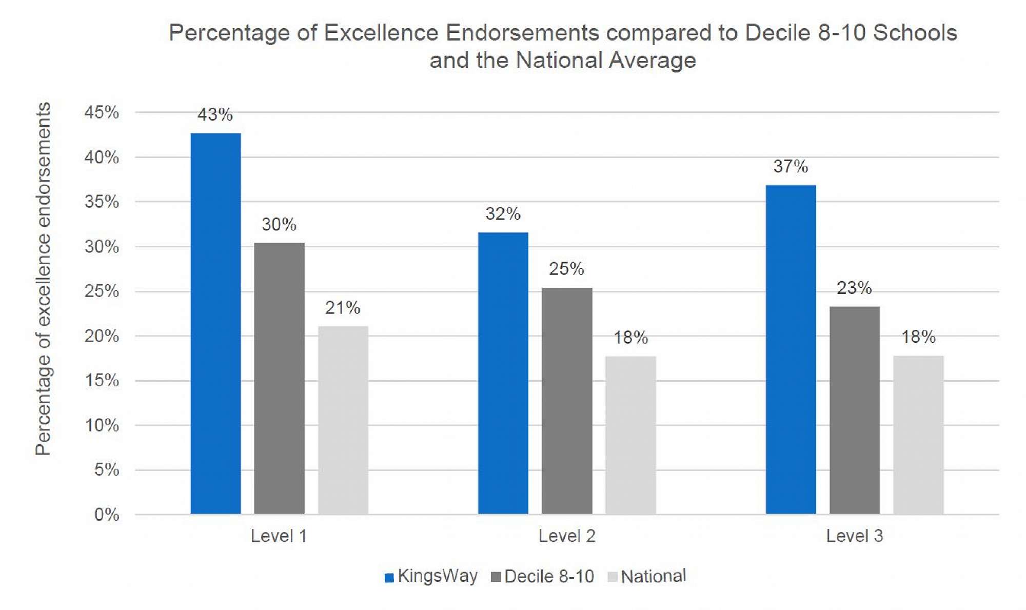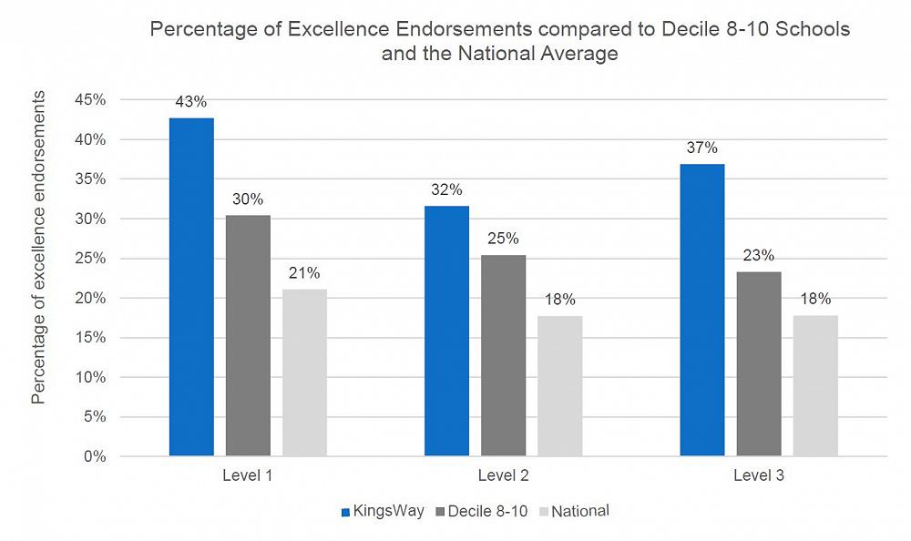 KingsWay’s Cohort achieved a significantly higher proportion of excellence endorsements than both the Decile 8-10 and the national average across all levels.