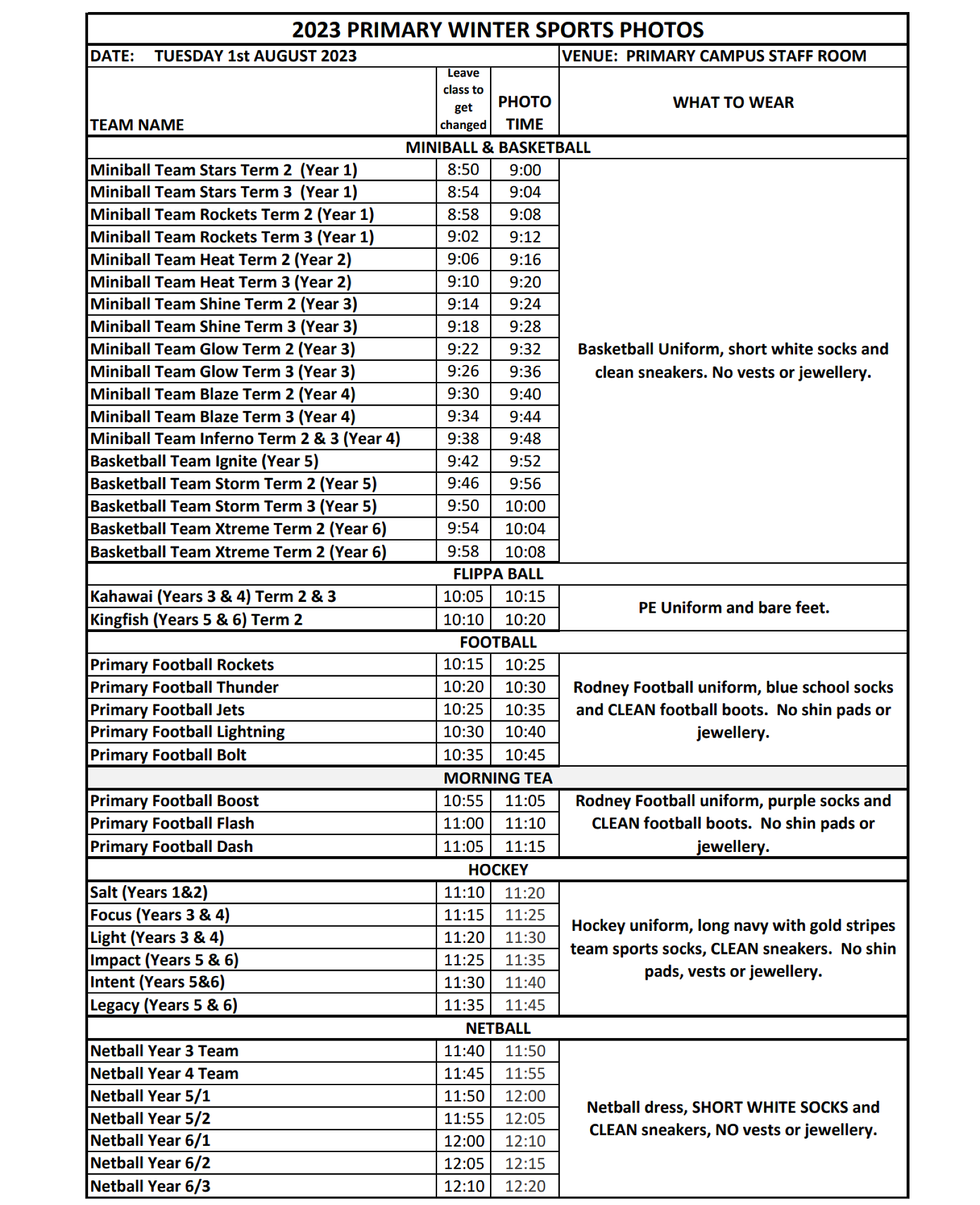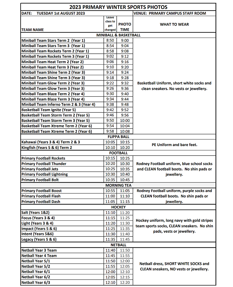Our Primary Winter Sports Photos will be taken this coming Tuesday 1st August in the Junior Campus Staff Room. Please ensure that your child takes the correct uniform and socks as per the details below to school. We reserve the right to remove your child from the team photo if they are not in the correct uniform. Please see the image below or pdf attachment at the bottom of this document.