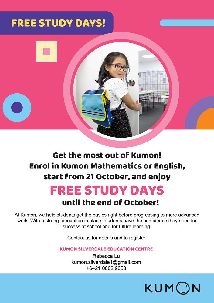 KumonKumon | Silverdale Branch @ KingsWay Senior Campus Start from 21st October and enjoy FREE study days until the end of October! | |