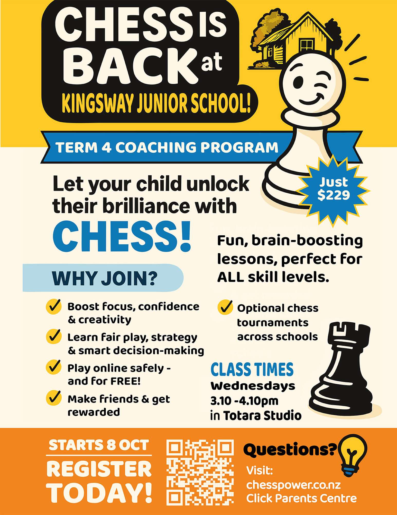 Before & After school programmes held at KingsWay Junior Campus 💡MONDAY Innovation Hub NEW THIS TERM Innovation Hub: Design and build a robot, working with robots, and technology inspired arts & crafts collide for ultimate innovation experience! (*Some classes may incur additional activity fee of $5 which will be invoiced separately.) 🔬TUESDAY Back by popular demand! Science Lab: Clear winner in Kids Choice Poll, Science Lab is where curiosity meets experimentation! 🥘WEDNESDAY Fantastic feedback from parents & kids, and running a close second in our Kids Choice poll, Food Detectives: Kids will choose the menu and practice making each item. And, we'll have our end of Term Cafe Experience where parents and family are invited to experience all the items their child has prepared! (*Classes may incur additional activity fee of $3 per class which will be invoiced separately.) ⚽THURSDAY NEW THIS TERM Skill Quest: Build your sports skills and agility through specifically curated drills, movements and activities designed build mind and body! 🏃♂️FRIDAY NEW THIS TERM Zoom Zone: Set your distance goal and work to achieve it! Each week's run will be added to your total and calculated at the end of the Term. Can you run 10Kms? 20KM? Or more?! Build endurance, stamina and increase lung capacity. Perfect training for those wanting to join the Weet-Bix Triathlon. Classes and clubs will be running all Term and your child can join at anytime. CLICK HERE for sKids after-school programmes at KingsWay School Junior Campus. |
