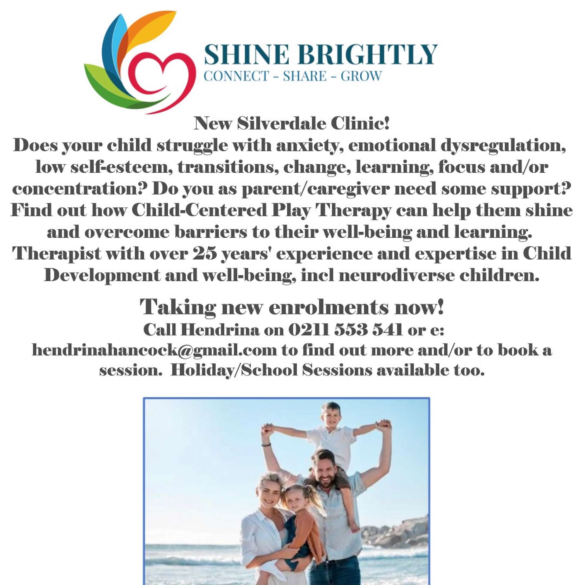 Shine Brightly TherapyHelping children with anxiety, emotional dysregulation, low self-esteem, transitions, change, learning, focus and/or concentration. Call Hendrina on 0211 553 541 | |