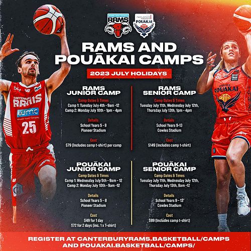 The Canterbury Rams & Mainland Pouākai offer Junior & Senior Basketball Camps boys & girls camps in the July holidays. The Camps are for School Years 5 – 13. The camps will be coaching by Canterbury Rams and Mainland Pouākai players. Sign up for the camps today.