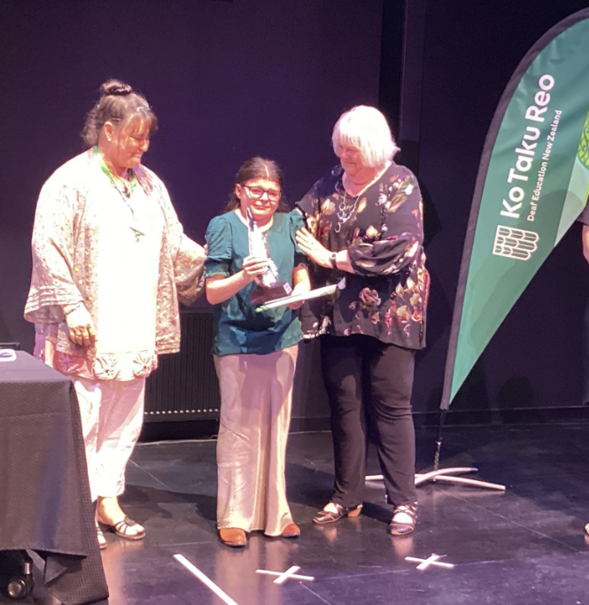 The second award was the Pruden Deaf Awareness Award. This award was in honour of Cyril and Norah Purden. Both were deaf and attended the first Deaf School in New Zealand, van Asch School for the Deaf in Sumner. The award is an old-style wooden school desk, in keeping with the style when they were in school. Their daughter, Kay Drew, gifted the desk to the school in their memory and was presented to a student to participate in Deaf Studies, represents Deafhood and is proud of their Deaf Identity. This was awarded to Noelani Richards.