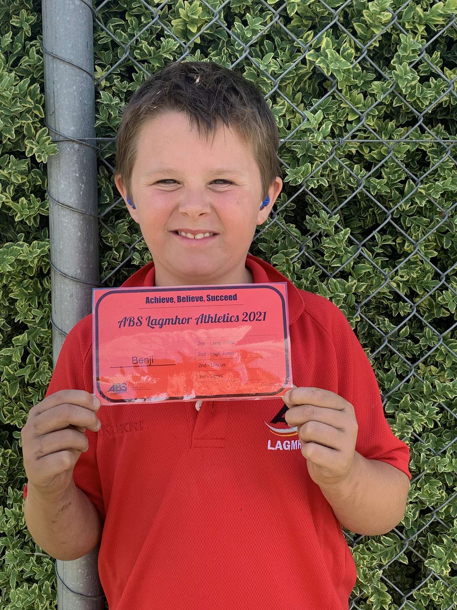 Benji enjoyed all the sports and demonstrated his expertise in 4 events. He placed 2nd in the long jump, 2nd in the high jump, 2nd in discus and 3rd in sprints for his age group.