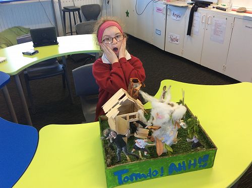 Hillmorton mainstream classes have been working hard this winter. Tanisha and Linh Da created miniature worlds in their art class. Pictured below is Tanisha’s work, it includes some of the VA staff running away from a tornado.