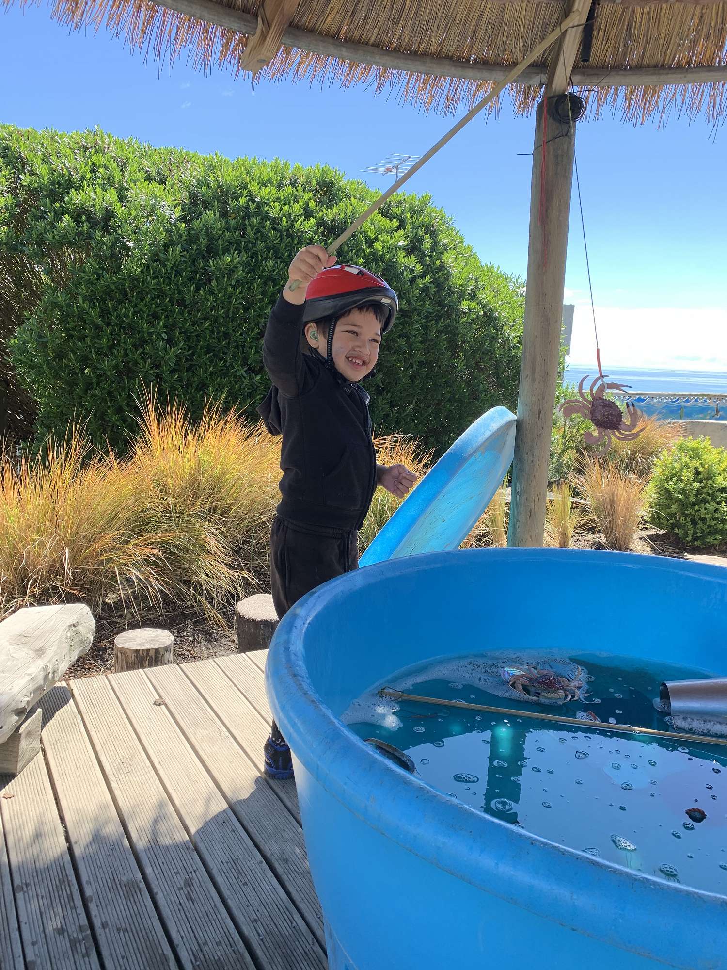 A good catch. Mythias catches his first crab in front of a stunning backdrop at his kindy in Oamaru.