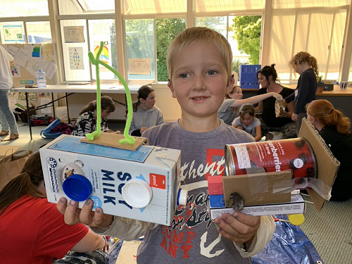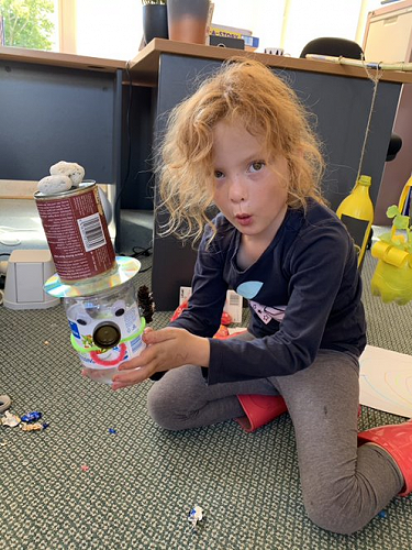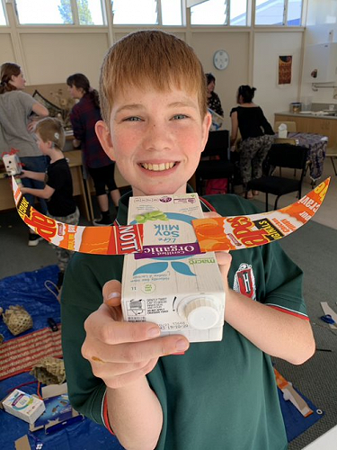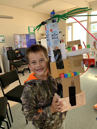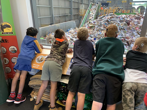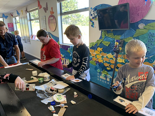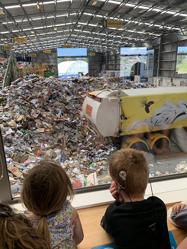 Truckloads of mixed recycling are emptied at the New Plymouth recycling processing facility every day. We watched the recycling getting sorted on a machine - paper from plastics and tins from aluminum cans. We must keep our paper and cardboard flat, take lids off bottles and containers, and only one, two, or five of our plastics can be recycled. We practiced sorting some recycled items and learned that recycling has to be bigger than the palm of your hand to go through the machine properly! After visiting the recycling centre we went back to the office and we reused materials to make our own creative changemakers art.