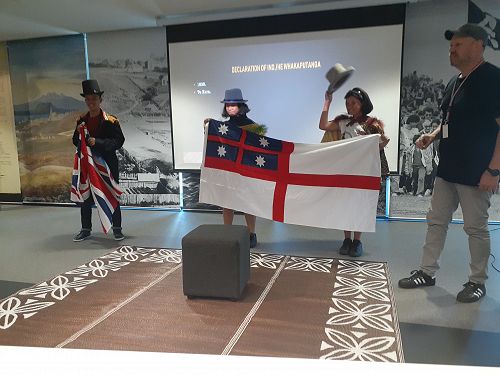 Finally - 10.30 am and time for the presentation. We were led to the He Tohu exhibition area and sat at lecture-type seats with tables to lean on and take notes. When the blinds were opened on the far wall - we could even see the building where the original treaty document was stored (and saved from fire) while it was in Auckland. The next two and a quarter hours were riveting. We traveled through time as the presenter used PowerPoint, and narration to present us with a historical narrative that began when British sailors first arrived on our shores, right up to the occupation of Bastion Point. The students were given an opportunity to role-play actual historical events with gorgeous costumes and props.
