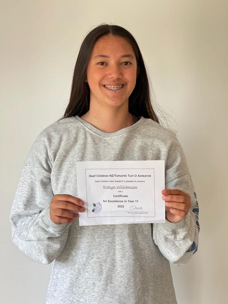 Evelyn Williamson at Burnside High School in Christchurch has won the Deaf Children New Zealand Certificate for Excellence in Year 11, 2022.