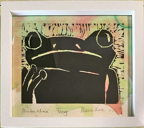 Maia also enjoyed working with the woodcut printmaking process and used a mix of printmaking and dye to create a curious little frog.