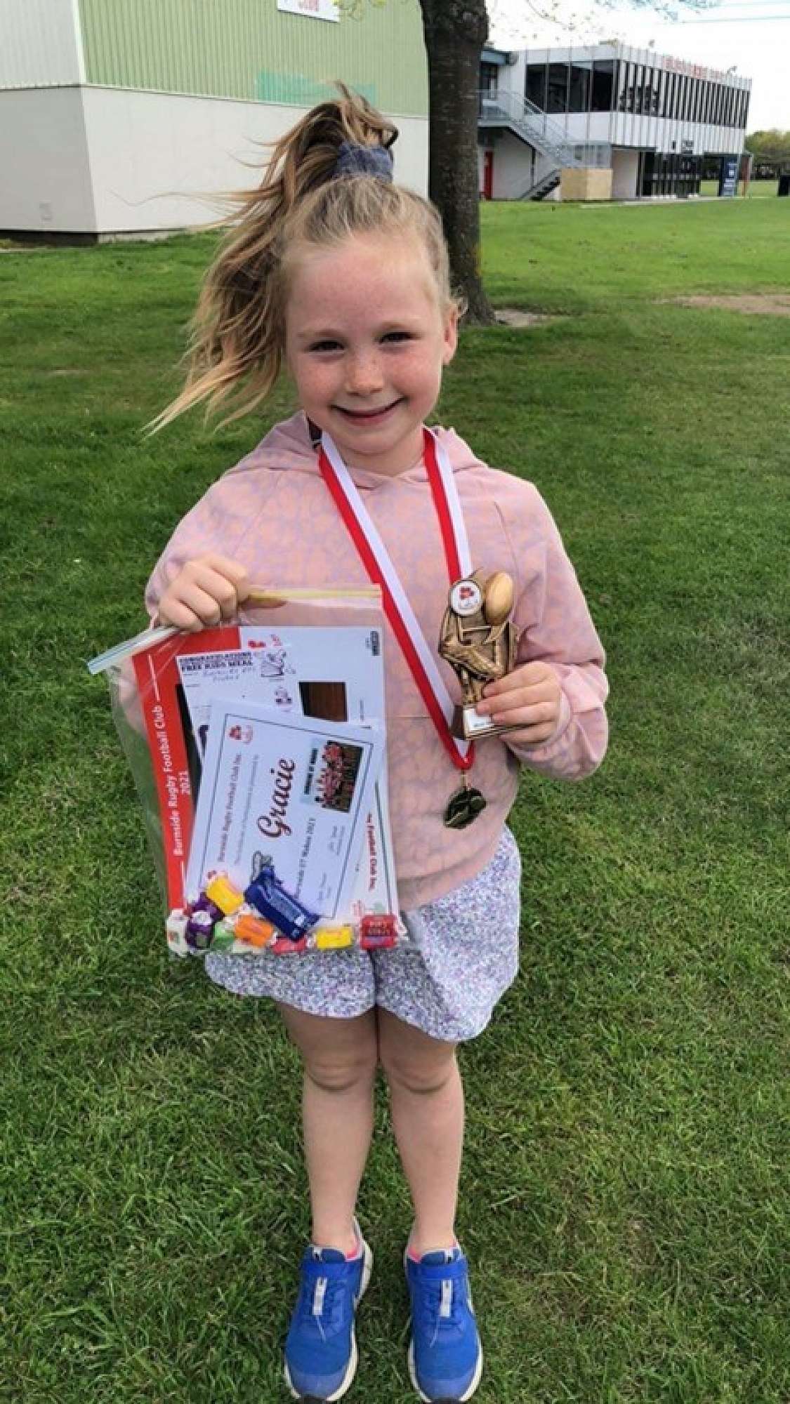 "So proud of our girl Gracie, awarded Most Valued Player (MVP) for Rugby this year 2021. Gracie scored a massive 25% of all tries this year, a total of 44 for the season”, said mum, Jendi Chin.