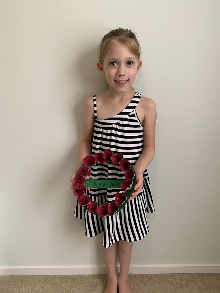 Emma (Room 4) has been busy making an ANZAC wreath to put in her window for ANZAC Day. She used an egg carton to make the poppies!