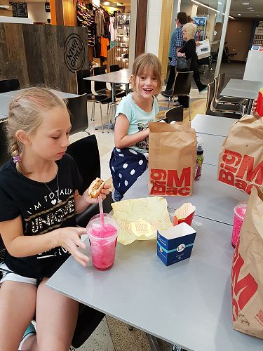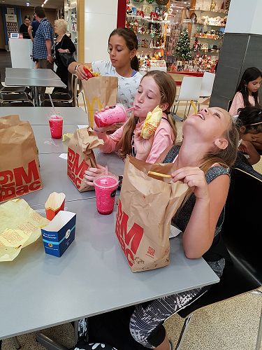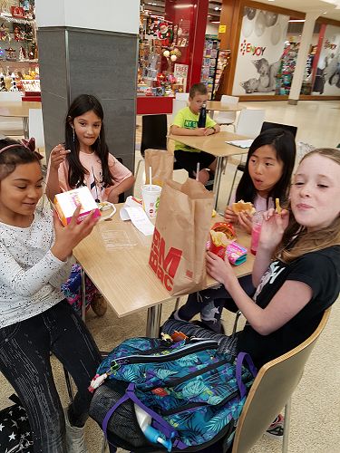 Inside the mall we completed a scavenger hunt, with questions from one end of the mall to the other. We had to find prices and particular shops and services. We even got to see Santa. Lunch was the BEST! McDonalds, Long John Silver, Dunkin' Donuts, St Pierre's Sushi and more in our lunch boxes. Our tummies were full.