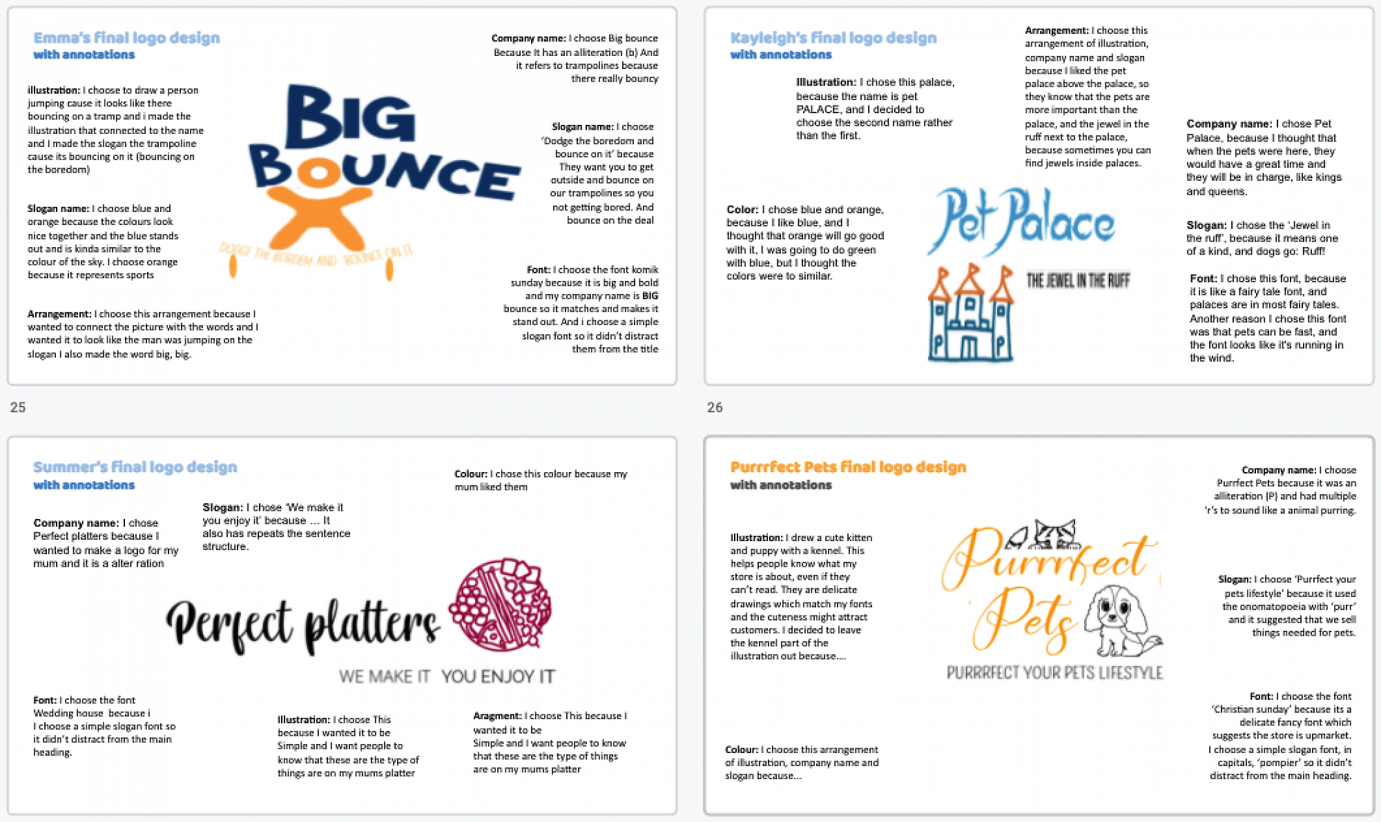 Students in Design Intro (with eTeacher Jen Hammonds) worked through an authentic process to create logos for imagined companies (or mum's company in the case of Summer!).