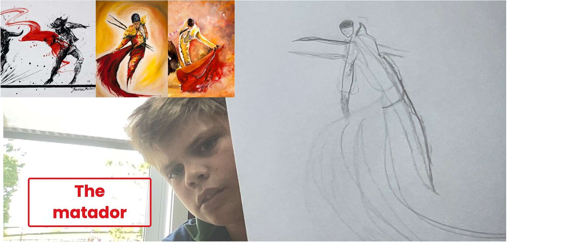 With movement we kept our drawings fluid, sketched core curves, lightly worked in limbs, then honed in on areas with cross hatching. With a variety of techniques under their belt, they chose either a matador or ballerina and any medium. What we started in Zoom students would work on after VLN classes had finished, but Seesaw was still open so we could continue to share.