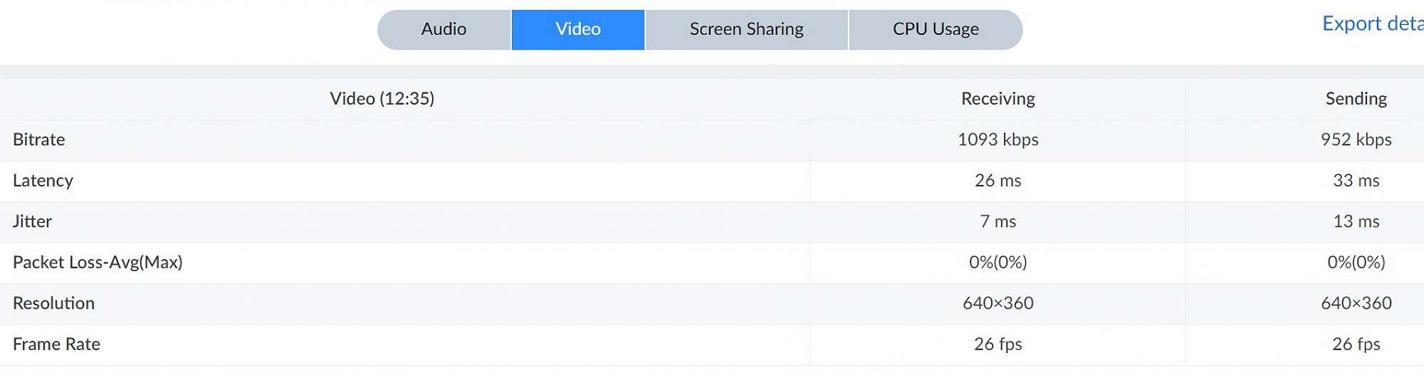 You can look at the technical details of each lesson in real time or later look back through meeting details. This is useful information to know if you need to trouble shoot or provide technical support. You can see live information about the quality of each connection and pinpoint where the trouble might be. I'm not a very technical person but i learnt that these are the things you need to look for, and outside the following parameters there are some bandwidth issues that may need to be sorted: