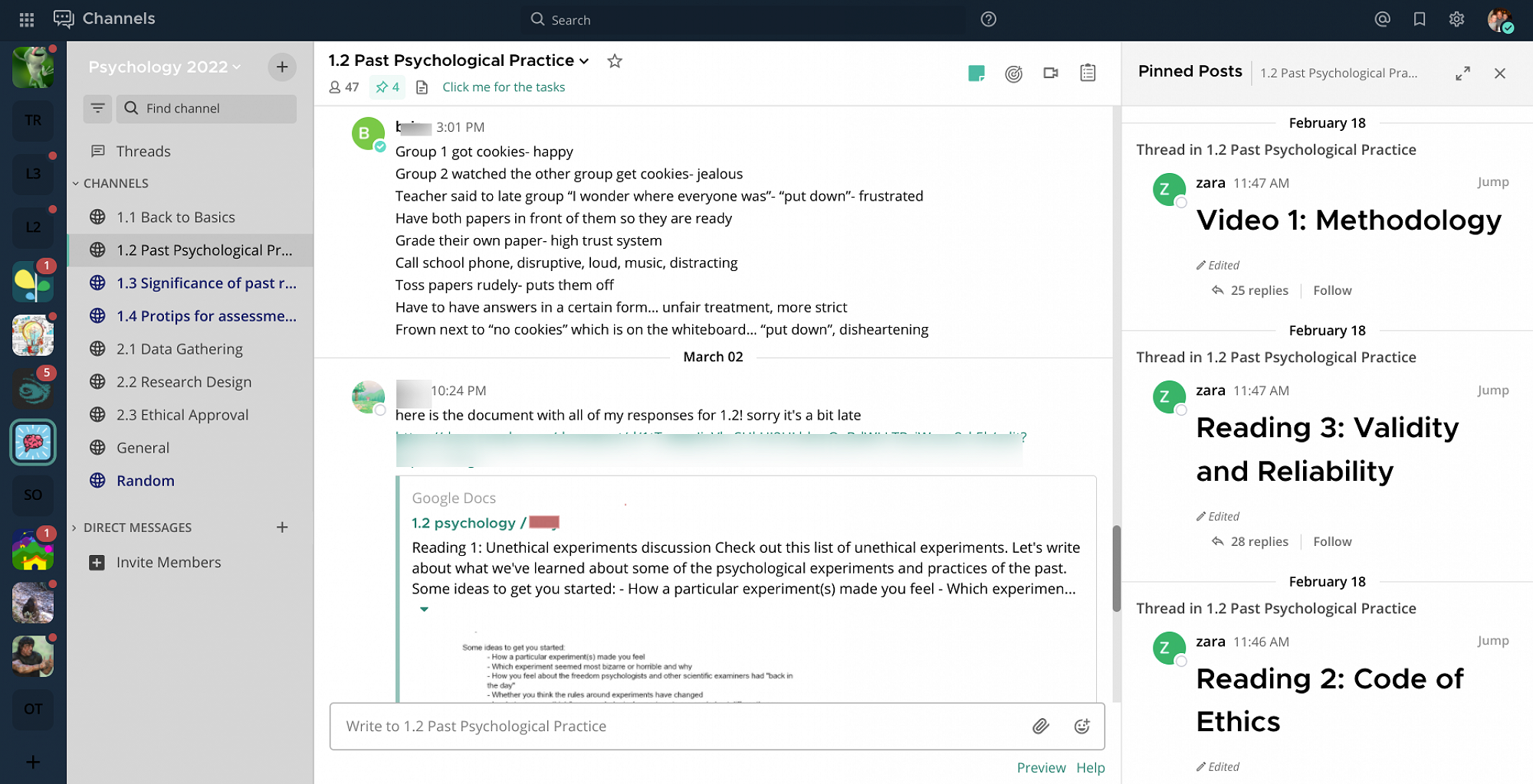 MatterMost is used as the ‘online hub’ where weekly tasks, assessments, meeting agendas are posted. MatterMost has a sidebar where all of these things can be easily accessed.