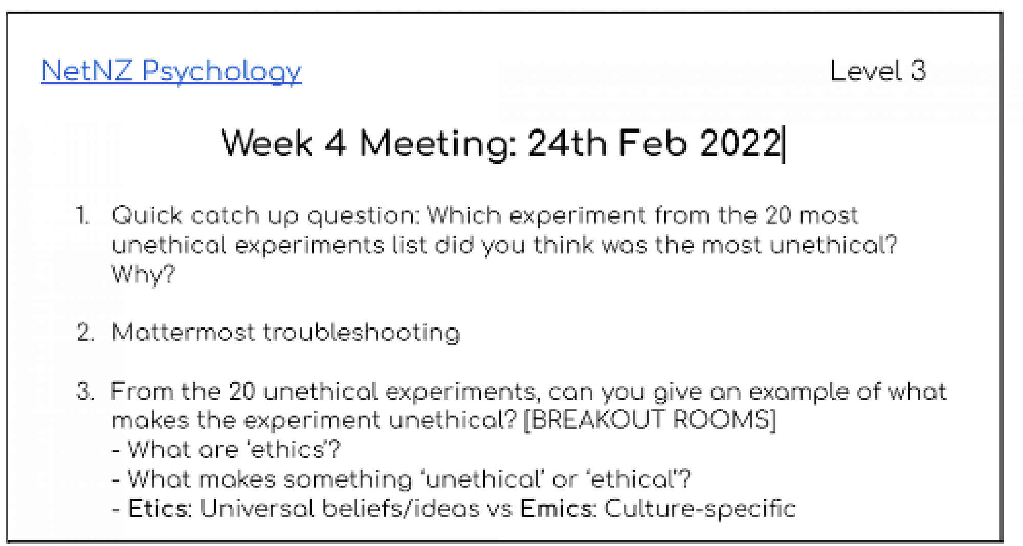 The agenda for the weekly VC’s are sent to students at the beginning of the week and are loosely the same for both classes. However due to different class dynamics and how the teacher likes to run their VC’s, it is up to the individual teacher. This allows the teacher to use their own personal style and veer off to where the students lead the discussions while still ensuring some consistency across the key concepts.