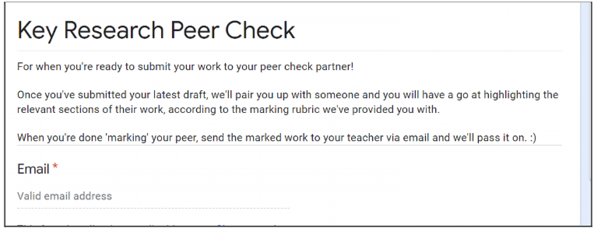 Another way for students to connect is through a peer check process. This year we introduced a more formalised process for assessments using Google Forms, where students would submit their work and we would pair them up with someone from the other class investigating a different piece of research. See snippet from the Google Form below. This allowed students to make sure they understood the criteria and what was required for each grade.
