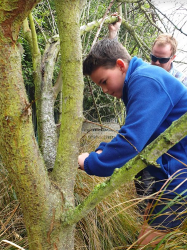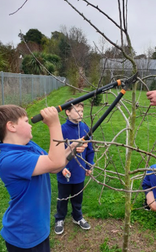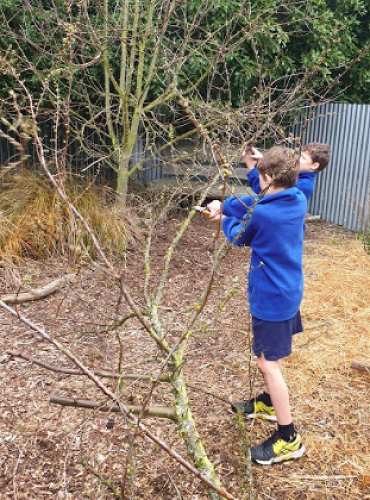 Harry, Blake, Jaden and Joe worked with Dan to prune the school's apple trees.