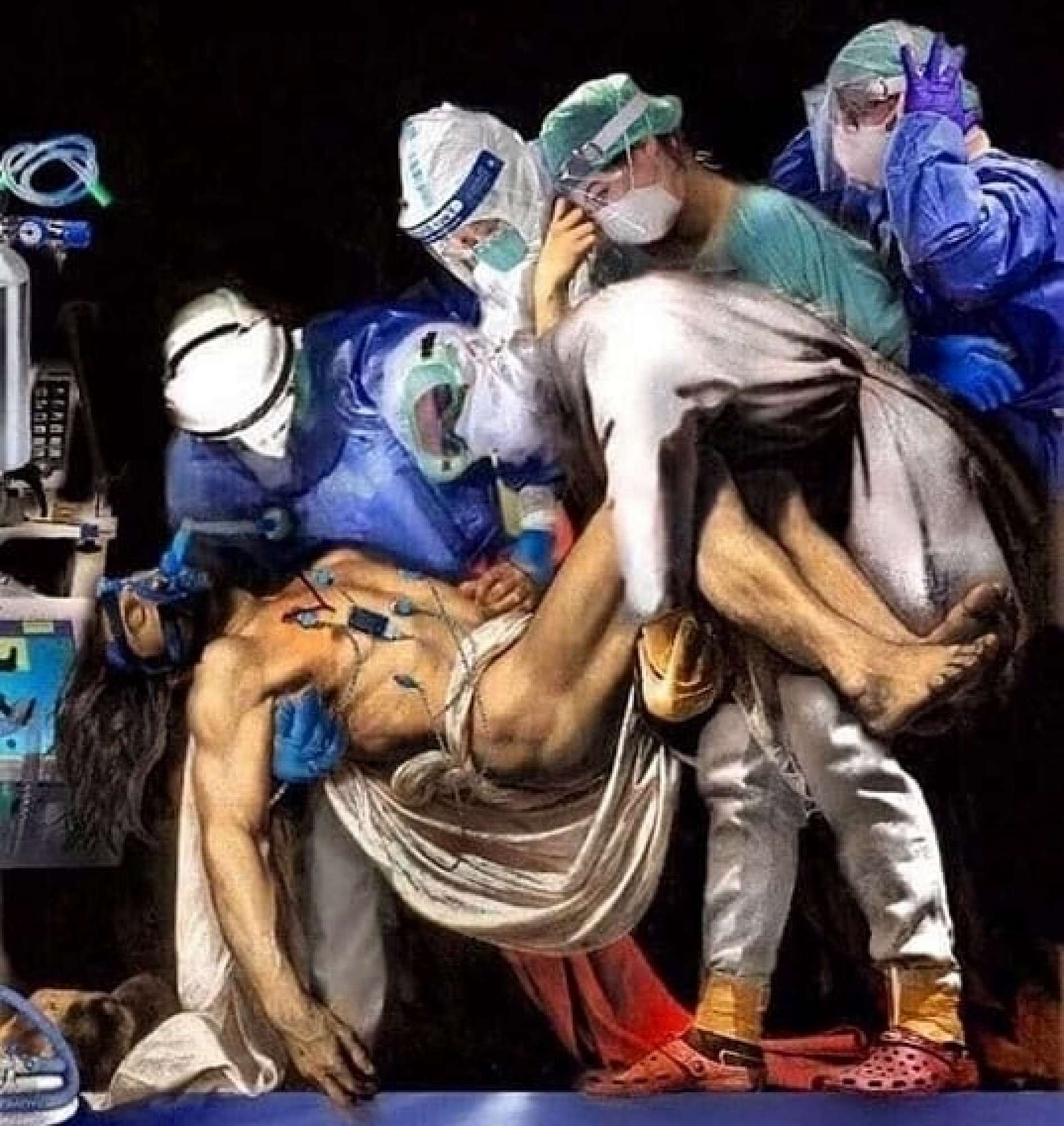 During Easter 2020, an art image appeared on social media. Variously titled,[3] with no claim to authorship, it depicts a moment of death. Central is the almost naked body of Jesus, his arm hanging limply. He has a ventilator attached to his face. On the far left of the picture is an oxygen bottle, while medical sensors are attached to his torso. Five health professionals cradle Jesus, all clothed in Personal protective equipment (PPE). At the rear, one holds his hands to his head, a gesture of despair. This gesture suggests the art image captures a moment of death.