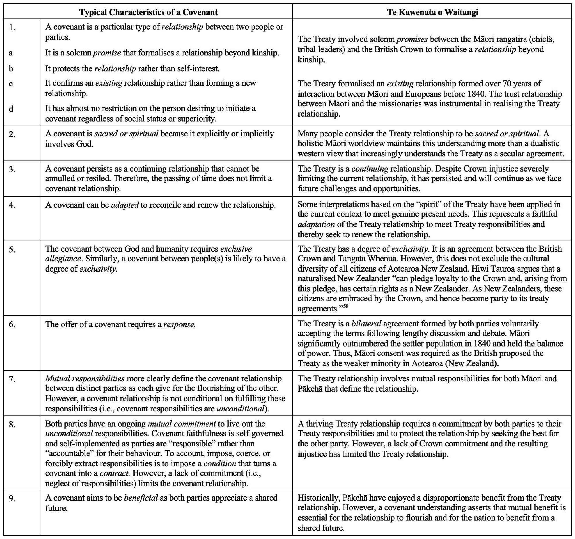 I have shown that the Treaty exhibits the fundamental, overarching characteristic of a covenant as the signatories appreciated that it would protect the relationship between Tangata Whenua and Pākehā. From this essential foundation, we can now briefly consider whether the Treaty is consistent with the other eight typical characteristics of a covenant. An initial concise comparison in Table 1 shows that the Treaty and its context map well onto all the identified characteristics of a covenant, and this provides further confidence in the legitimacy of understanding the Treaty relationship in covenantal terms.