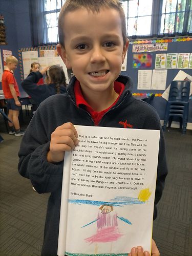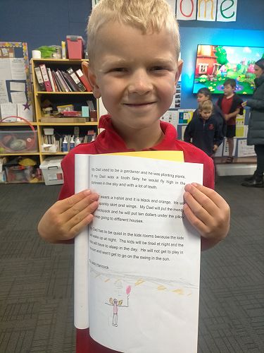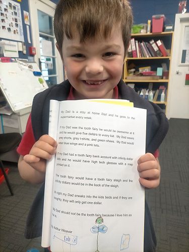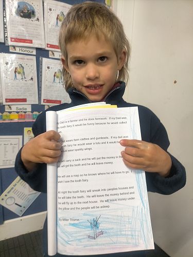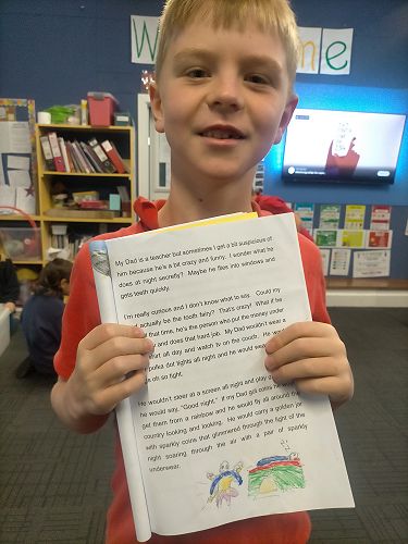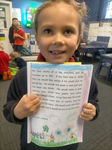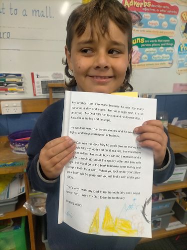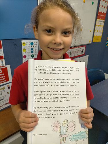 My Dad is a sales rep and he sells seeds. He looks at grass and he drives his big Ranger but if my Dad was the tooth fairy he wouldn't wear his boring pants or his beautiful shoes. He would wear a sparkly bow, a sparkly tutu, and a big sparkly wallet. He would sneak into kids bedrooms at night and swap a shiny tooth for five bucks. He would sneak out of the window and fly to the next house. At day time he would be exhausted because I don’t want him to be the tooth fairy because to drive to special places like Rangiora and Christchurch, Darfield, Hanmer Springs, Blenheim, Pegasus, and Invercargill.