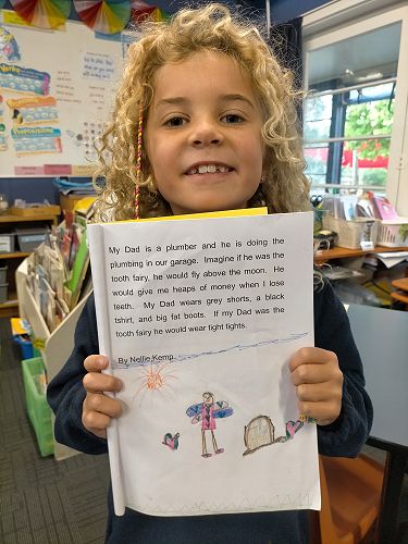 My Dad is a plumber and he is doing the plumbing in our garage. Imagine if he was the tooth fairy, he would fly above the moon. He would give me heaps of money when I lose teeth. My Dad wears grey shorts, a black tshirt, and big fat boots. If my Dad was the tooth fairy he would wear tight tights.