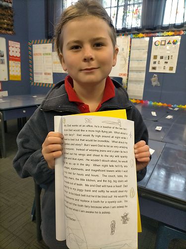 My Dad works at an office, he’s a teacher of the law but I think Dad would like a more high flying job. What about a tooth fairy? Dad would fly high around all night while I went to bed but that would be incredible. What about my cuddles and story? But I want Dad to be so very amazing to everyone. Instead of wearing jeans and a plain tie he’d spread out his wings and shoot to the sky with sparkly pants and blue eyes. He wouldn’t slouch about, he would fly up, up, up in the sky. When night falls he’ll fly into cottages, apartments, and magnificent towers while I wait in my bed for hours and hours. The couch, table, the tumbly chairs, the little kitchen, and the big, big stairs will be made out of teeth. Me and Dad will have a feast! Dad would fly to my piggy bank and softly he would steal my money! In his black belt but he’d be tired out! He would fly into bedrooms and replace a tooth for a sparkly coin. I’m glad dad isn’t the tooth fairy because when I am asleep he is awake and when I am awake he is asleep.