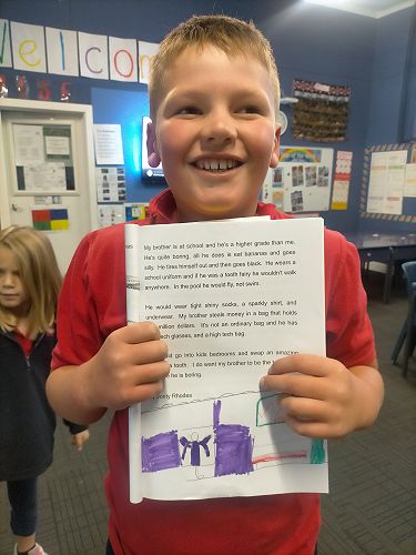 My brother is at school and he’s a higher grade than me. He’s quite boring, all he does is eat bananas and goes silly. He tires himself out and then goes black. He wears a school uniform and if he was a tooth fairy he wouldn’t walk anywhere. In the pool he would fly, not swim.