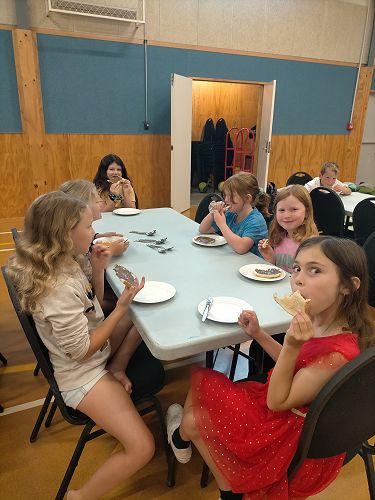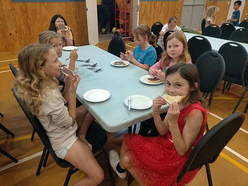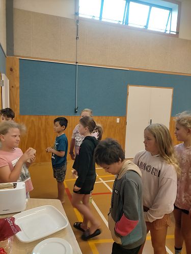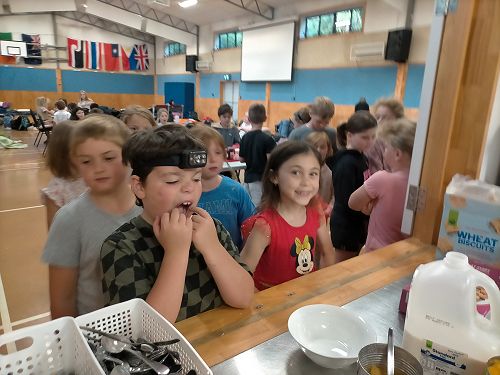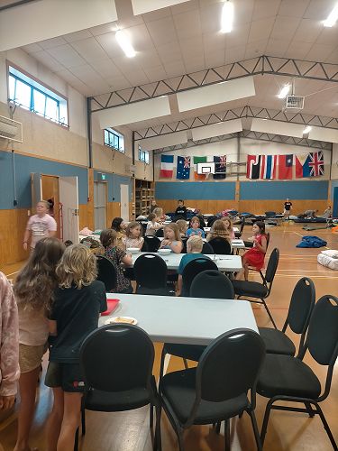 In the school hall, we had an overnight camp and we played lots of fun games. Mr Cavanagh played funny songs and one of the songs made Mrs Munro laugh. I made yummy toast for everyone. We had to do the dishes after we had eaten. Katie Thomson