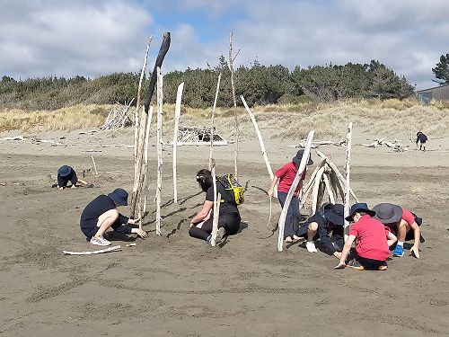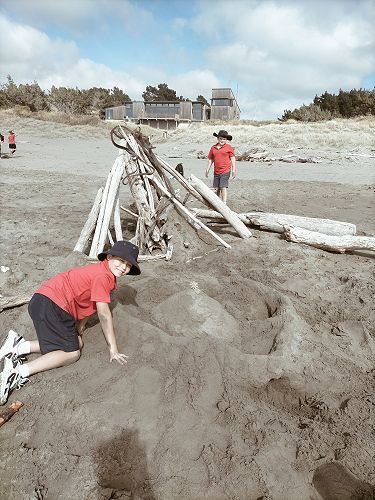 This is me and my group making a big sand castle at the beach. Then we did a treasure hunt and we went to the farm too, it was fun. The treasure hunt stuff to find was a chicken, tree, leaf, insects, spider, rocks, and twigs. Then we had two choices to go swimming or go to the playground. I went to the playground and they let us in the pool. Me and Josef dumped our heads in the pool and legs. Then we went back to the playground. I went down on the spinning thing, it was so fun. Hadley Schaffer