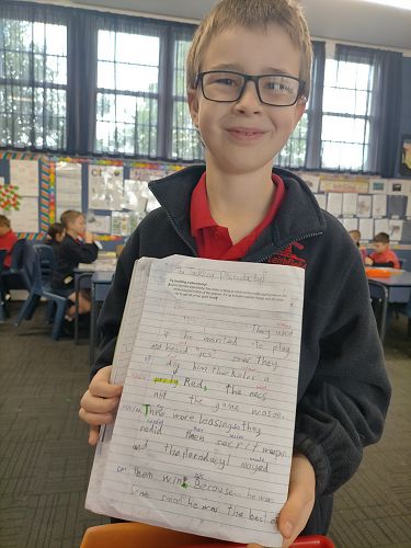 A giant zombie pterodactyl wanted to play rugby but he didn’t know how to play rugby so the players helped the pterodactyl play the game, but he flew away. The pterodactyl came back and scored a goal. Rugby was fun and I was excited because we won two goals. By Aaliyah