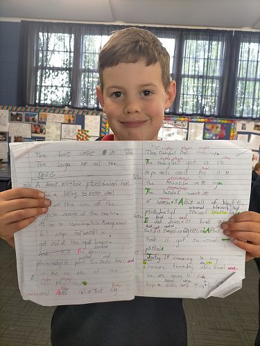 A giant zombie pterodactyl swoops up to space and the team lure him down with broccoli and scored a try. We won! The game was fun. I was excited. Rugby is fun! It was rad. There was a zombie pterodactyl that didn’t know how to play rugby. The team didn’t lure him down with broccoli. They left him to wear their team colour. It was a good game and it was rad. I liked it and it was fun. The amazing crowd roared. The giant zombie pterodactyl was famous. He got 100 views because he got a huge trophy. His house is made out of rock. He lived a happy life with his children and wife. By Eddie.
