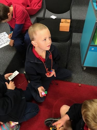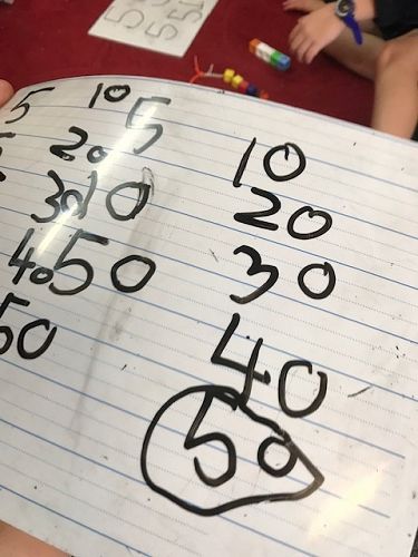 Children learning about numbers must be exposed to many different representations. In the photos Kiwis have developed their understandings of five in different ways. Callum and Dev are showing us five fingers, a five necklace, and a block that is five cubes long. James has shown five using his name that has five letters along with circles showing five halves. The children had a great deal of fun identifying the children in Kiwis whose names have five letters - Lucas, James, and Louis, An extension of our 5 thinking has included 50. Hunter has used the bead frame to show 50 as groups of 5. Children are also beginning to develop an understanding that 50 is also 5 groups of 10 - 10,20,30,40,50
