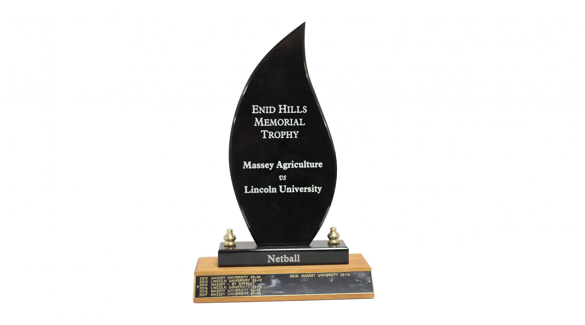 The Enid Hills Memorial Trophy commemorates Enid Christian who was the first female who enrolled at Massey in 1932 as an 18-year-old, graduating from what was then Massey Agricultural College in 1933 with a Certificate in Poultry Farming. The trophy has been played for between the Netball sides since 2012, one year after the first match was instigated.