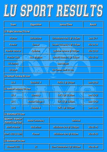 At Lincoln: Lincoln University 34 (Logan Bell, Jack Stratton, John McKeefry, Connor Garden-Bachop tries; Sam Gilbert 4 conv, 2 pen) beat Sumner 13 (Tom Crozier 2 tries; Tom Ziolo pen). HT: 6-10. Referee: Blair Barclay.