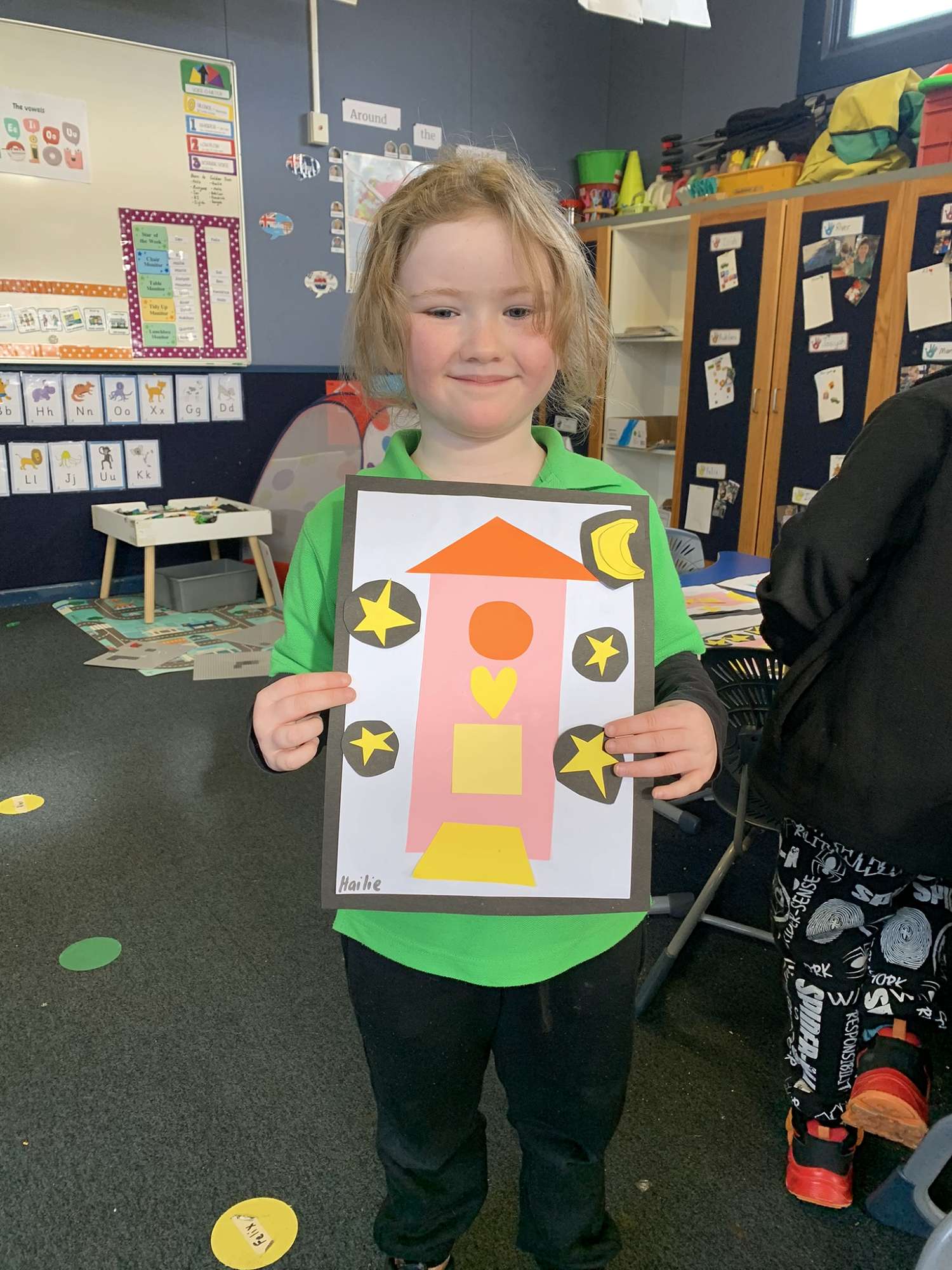 “We made rockets and it looks like it is in space. We learnt about different shapes. My favourite shape is the heart.” Hailie