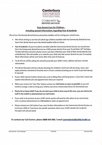 ​​The Community Dental Service provides free oral health services for all eligible children residing in the Canterbury and South Canterbury District Health Board areas, phone 0800 846 983 or email commdental@cdhb.health.nz.