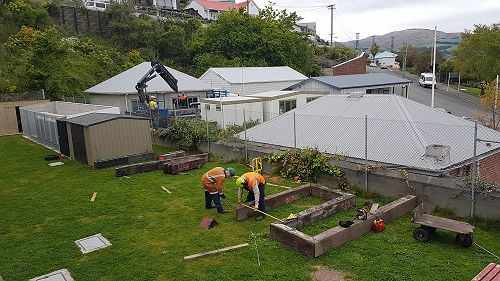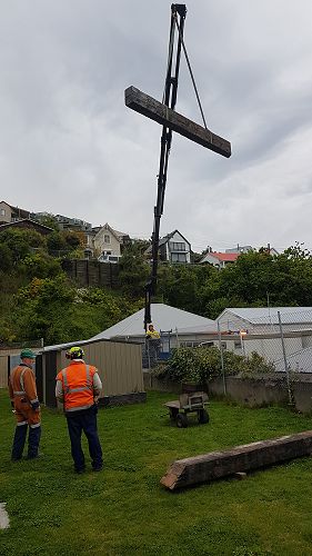 Thank you to Lyttelton Port Company (L.P.C.) as they have been very generous in gifting the school garden surrounds. The timbers are truly impressive and the fact they came precut and fully installed on site! The timbers were lifted on to the site thanks to Marinetec who donated the use of a crane and Andrew the crane operator. Soil from Living Earth and Stark Bros Ltd delivering and lifting on to site.