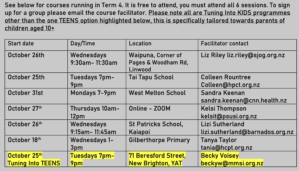 Please find attached flyer for the term 4 'Tuning into Kids' parenting programmes that Mana Ake are offering in Christchurch.