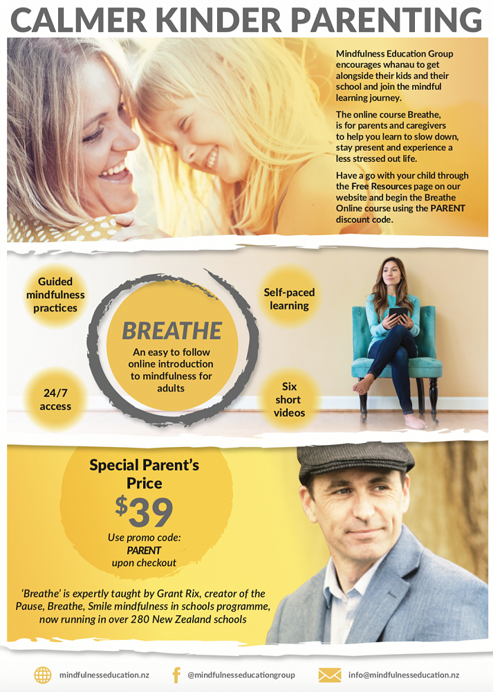 The flyer contains a special offer for Parents and Caregivers to purchase the ‘Breathe’ online mindfulness course at a discounted rate.