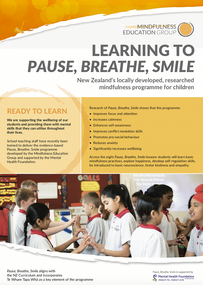 Pause, Breathe, Smile: New Zealand’s only locally-developed evidence-based mindfulness in schools programme.