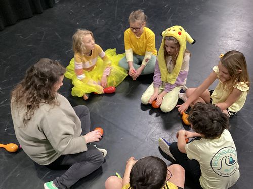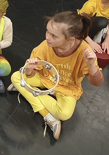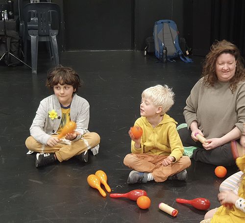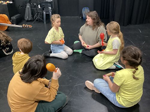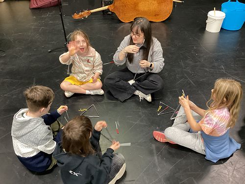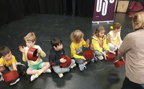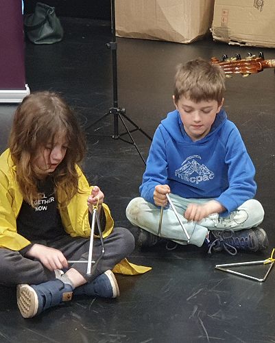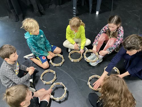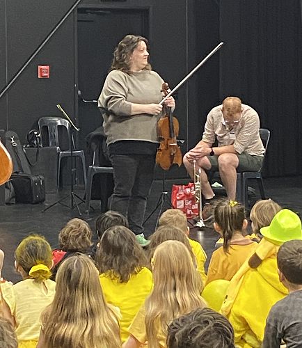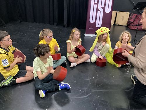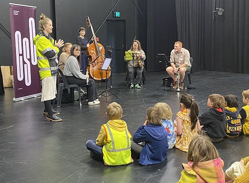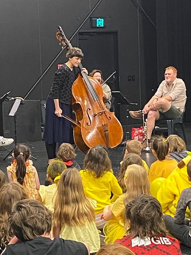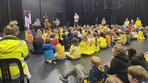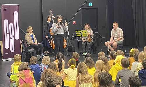 Kōwhai students were led by the CSO in a music lesson that saw them learning four different rhythms, trying out some percussion instruments, forming their own mini orchestra, and playing along with the musicians and composer.