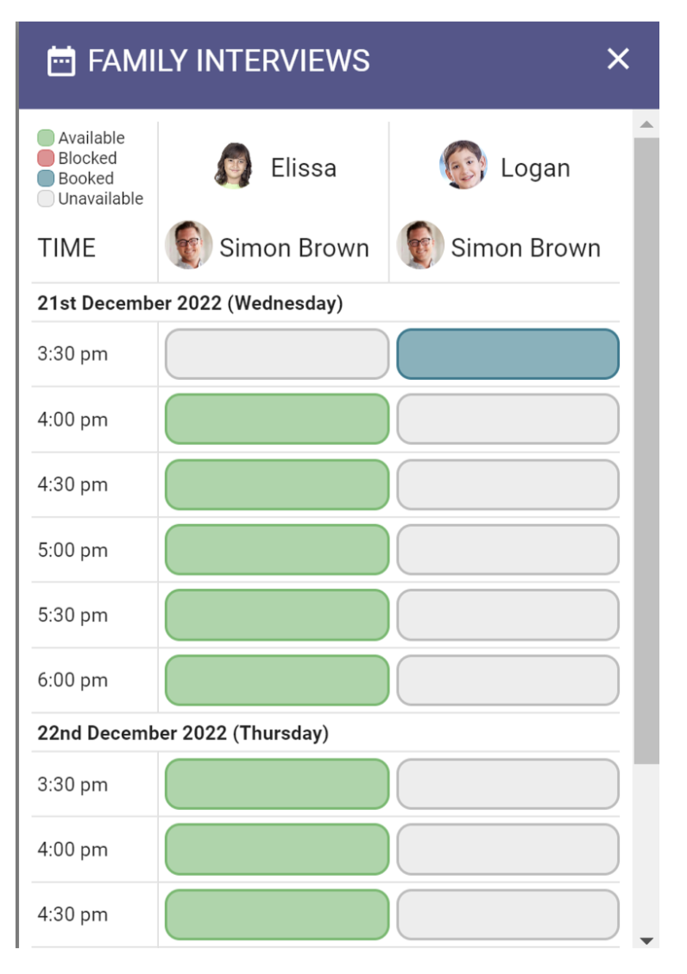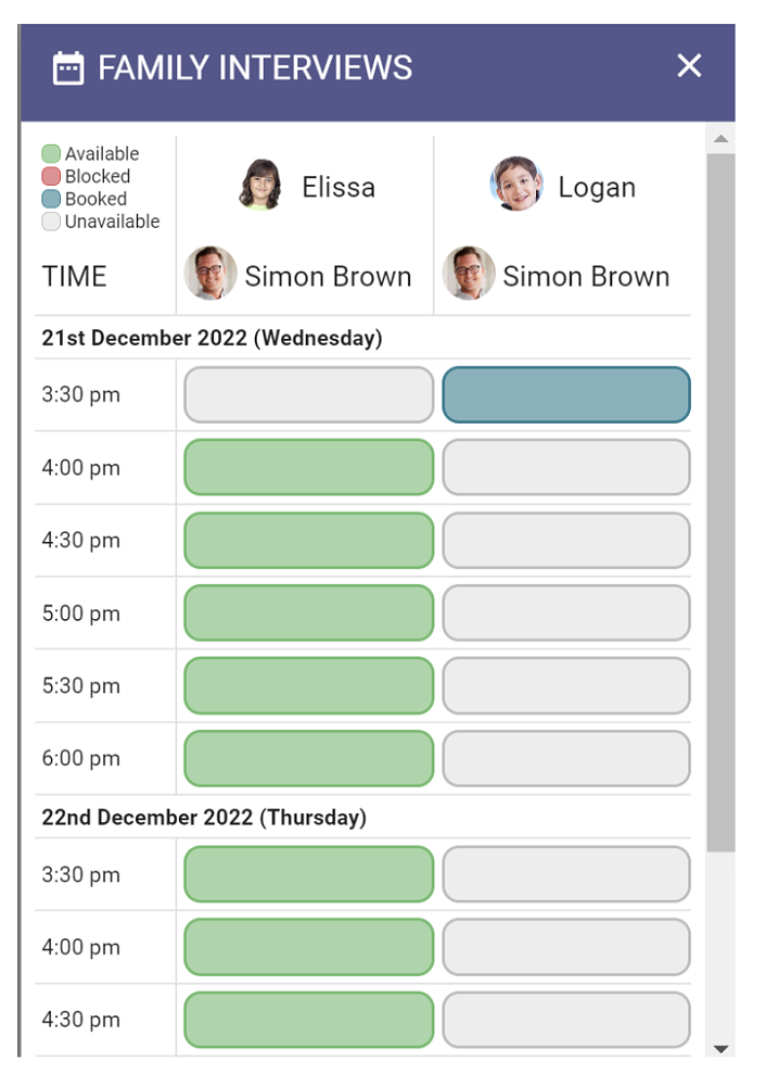 2. This will display a table of all available slots for all of your associated students, to enable you to co-ordinate bookings across multiple students.