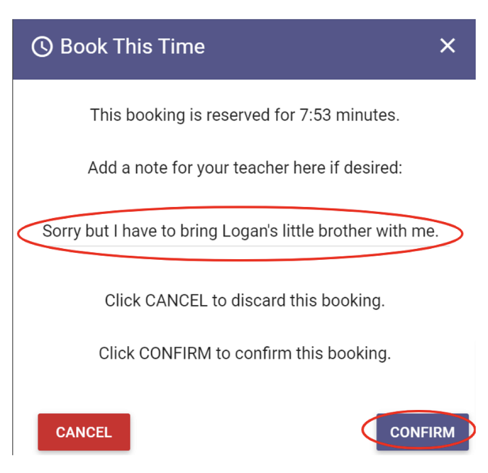 4. To add a booking, click a GREEN slot. The booking popup will be displayed. You will have the option of entering a note for the relevant teacher, if required.